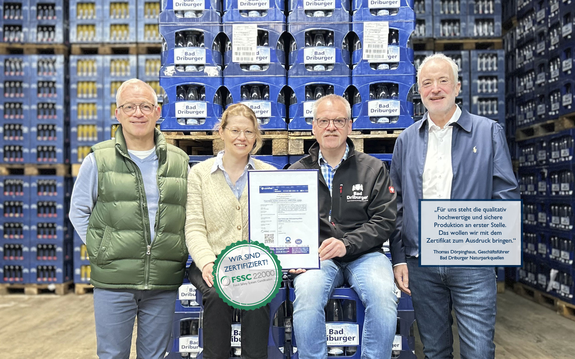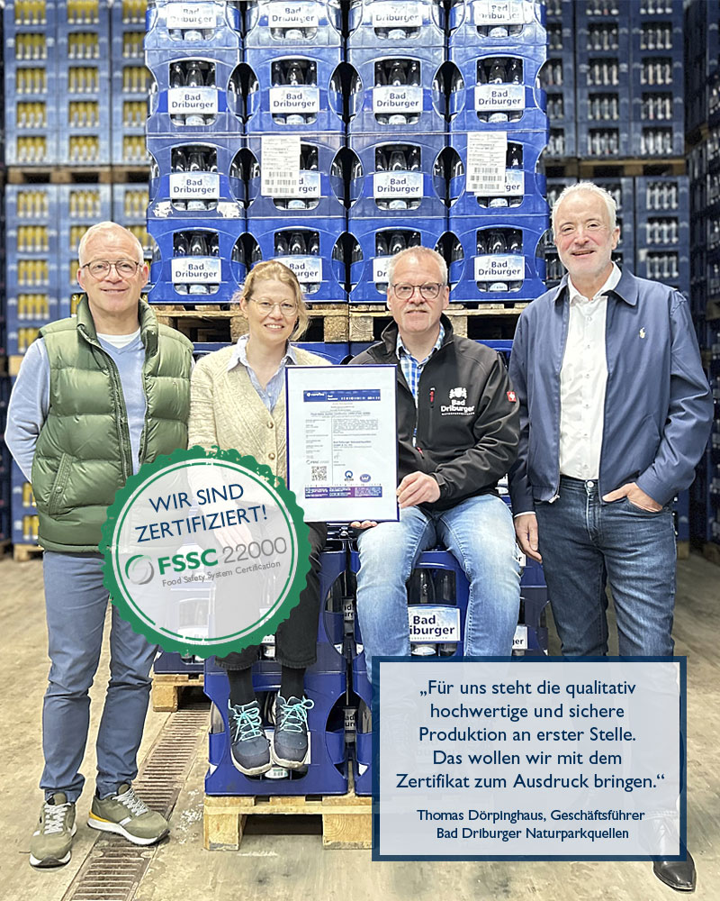 Wir, die Bad Driburger Naturparkquellen, haben erfolgreich die international anerkannte Zertifizierung nach FSSC 22000 (Food Safety System Certification) erhalten. Die Auszeichnung belegt, dass unser Brunnenbetrieb höchste Anforderungen an die Lebensmittelsicherheit erfüllt und seine Prozesse konsequent auf die Sicherheit und Qualität des Produkts – dem Lebensmittel Wasser – ausgerichtet sind.